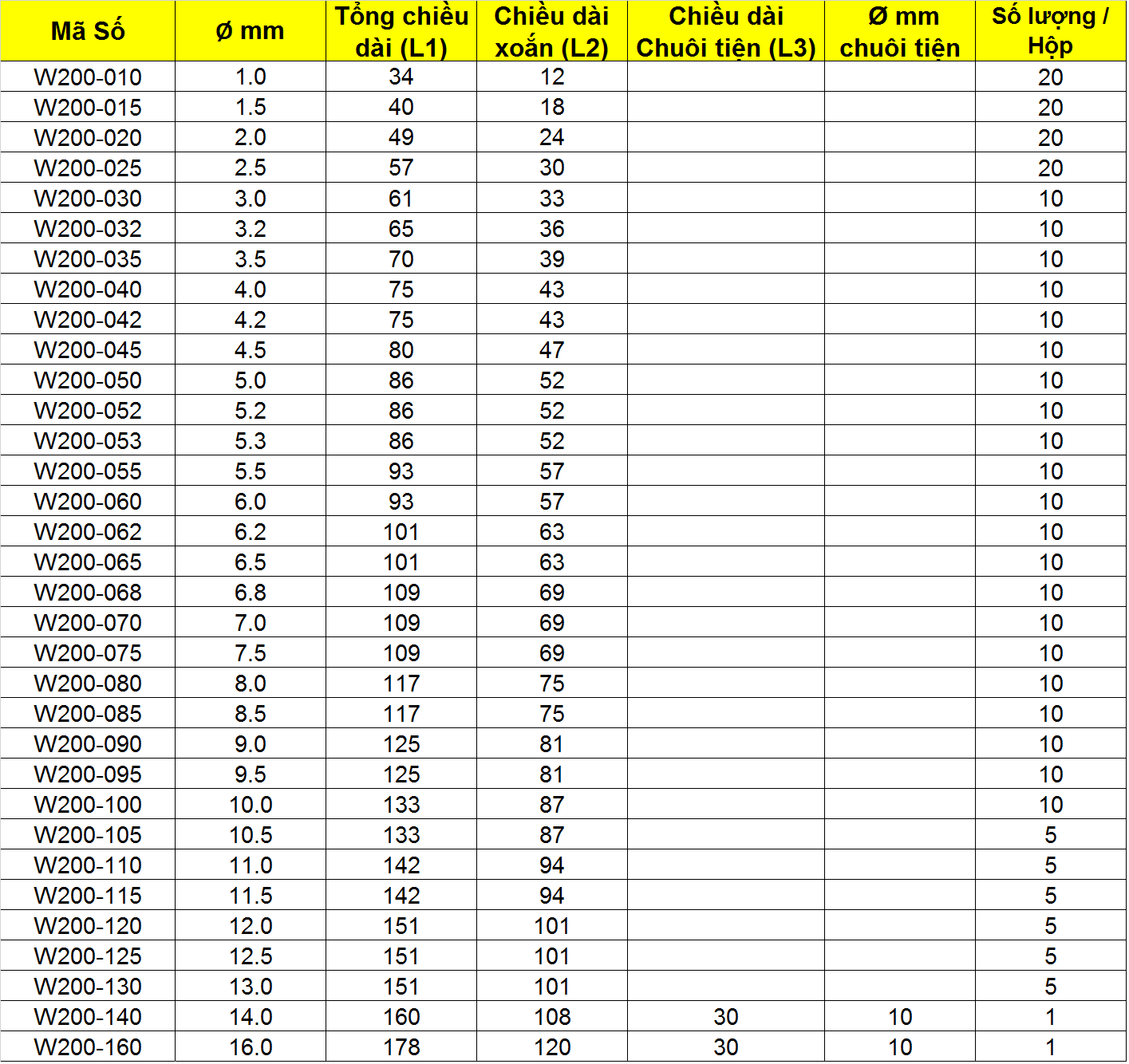 - Mũi khoan sắt thép HSS-R , Mã SP WAVES W200, được làm từ thép gió HSS với cấp cao M2, với độ cứng 64 - 66 HRC, chất lượng vượt bật hơn so với các loại mũi khoan sắt làm từ vật liệu HSS đang có mặt trên thị trường.